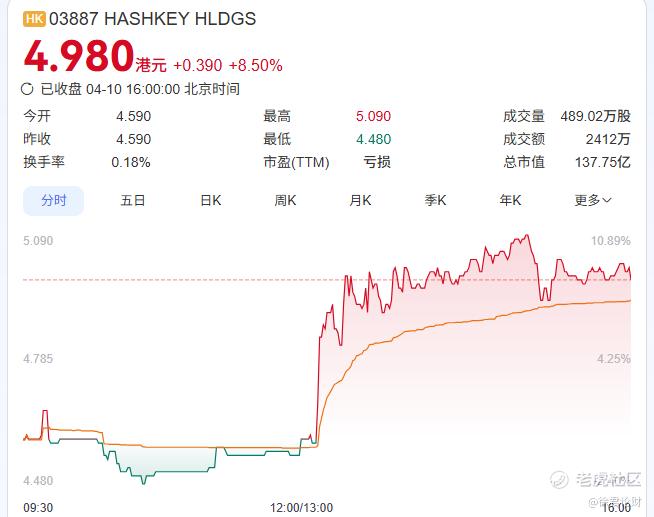 但真正的猎手,看到的却是另一个标的。牌照公布的当日,HashKey(3887.HK)股价涨超8%。这并非偶然。因为在这个游戏中,淘金者众,卖铲者王。而HashKey,恰恰是那个站在稳定币浪潮最上游、手握铁铲的基础设施提供商。