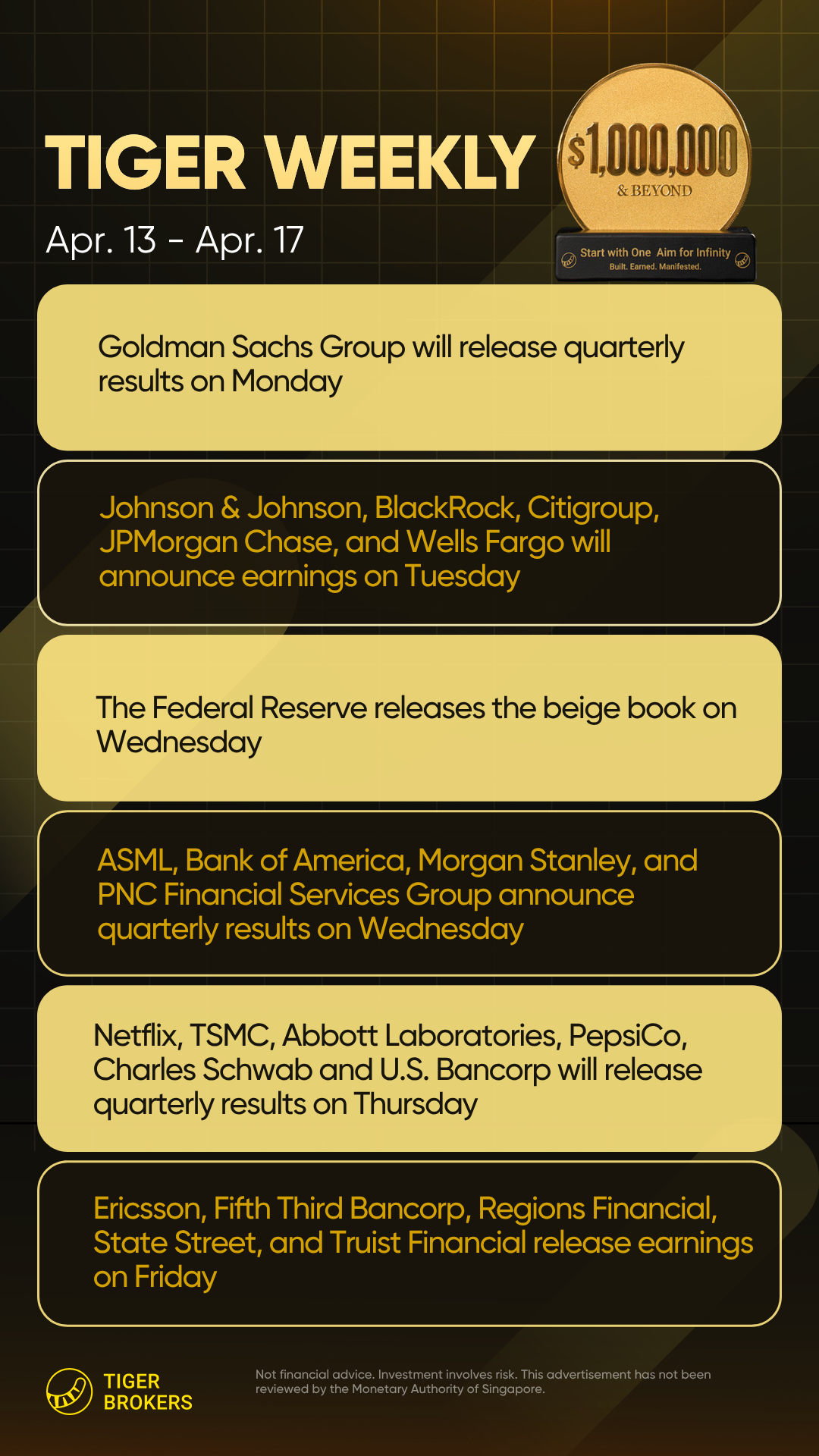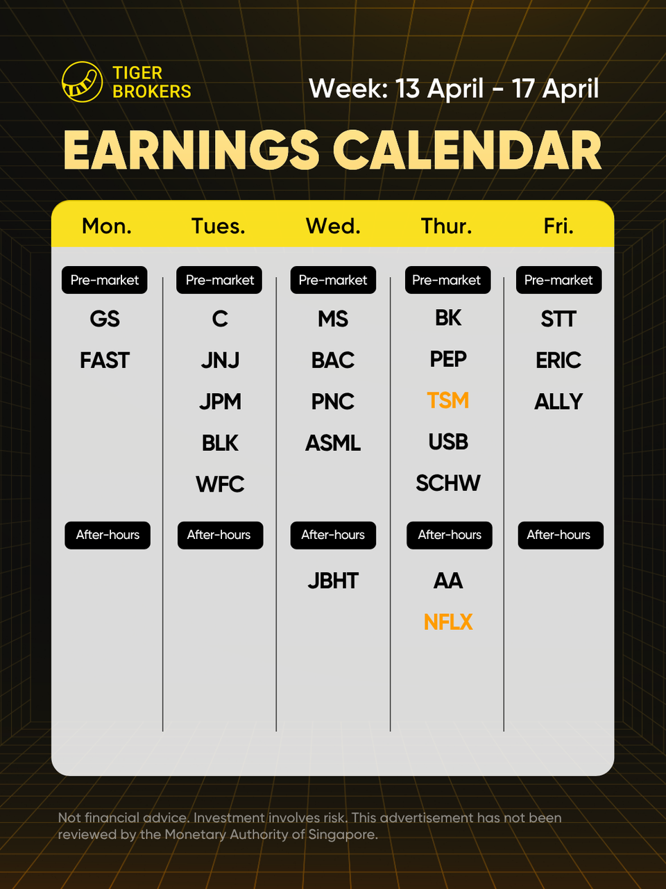 周四: $台积电(TSM)$ ——全球最大晶圆厂,关注AI芯片(HBM/CoWoS)供应限制及资本支出计划;奈飞(NFLX)——订阅增长及广告层变现进展。