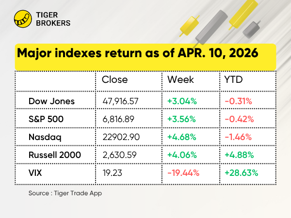 两周反弹——纳指累涨约9%,标普500涨约7%,道指涨约6%,完全收复3月失地。