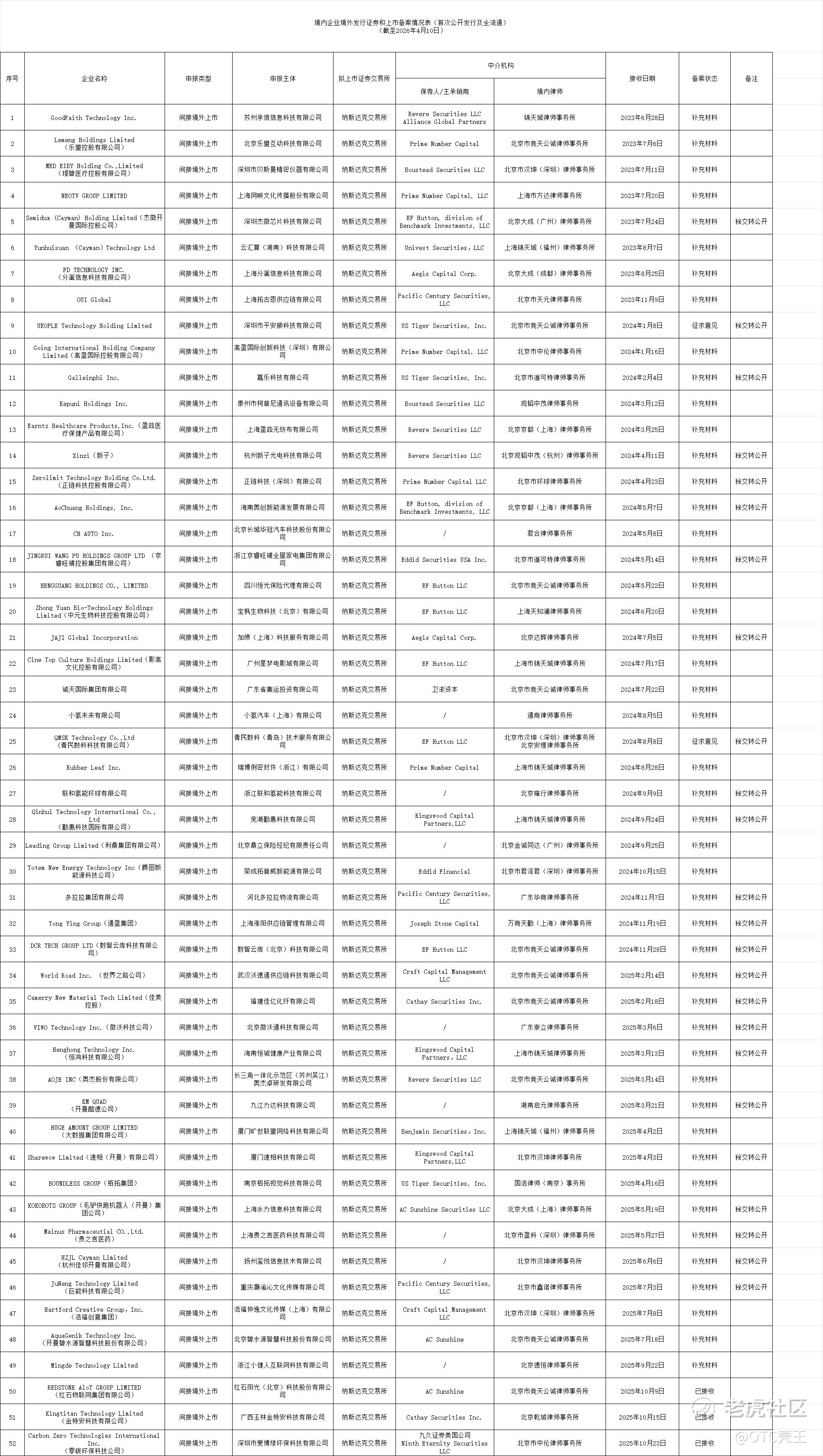 4月10日,中国证监更新境内企业境外发行证券和上市备案情况表(首次公开发行及全流通),对3家企业出具境外发行上市备案补充材料要求。