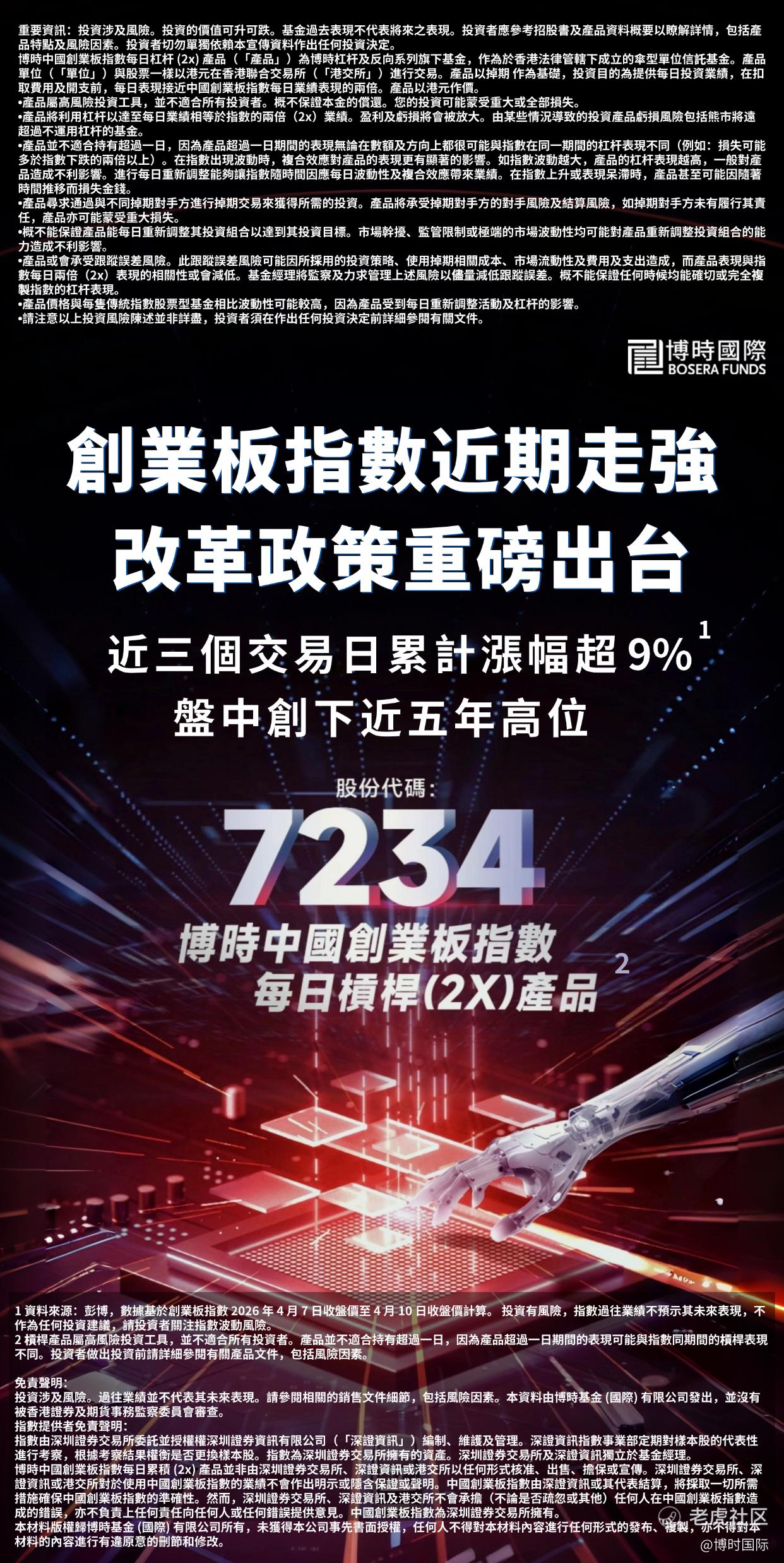 关注 $博时两倍做多中国创业板(07234)$ ,作为聚焦创业板板块的高弹**易工具,旨在扣除相关费用及开支前,紧贴追踪创业板指数每日两倍表现,助力投资者把握创业板短期趋势及指数波动相关的交易机会。