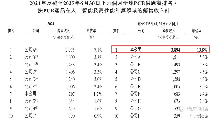 胜宏科技2024年在中国大陆PCB供应商中排名第五,2025年上半年排名第三。以2025年上半年PCB在人工智能及高性能计算领域的销售收入计,本公司在全球PCB市场中排名第一。本集团在全球PCB市场人工智能与高性能计算领域的排名由2024年的第七位跃升至截至2025年6月30日止六个月的首位。