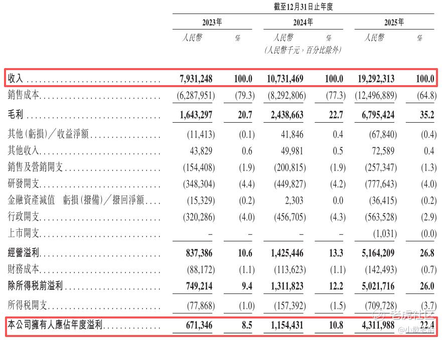 公司从2023~2025年的营收分别是79.31亿、107.31亿、192.92亿,2025年营收同比增长79.77%;2023~2025年的净利润分别是6.71亿、11.54亿、43.12亿,2025年的净利润同比增长273.52%,公司业绩大涨。