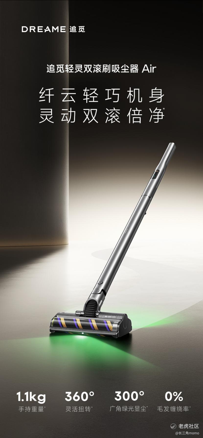 针对用户高频痛点,追觅 Air带来全流程体验升级。360°万向灵动双滚刷搭配300°绿光显尘,微尘污渍一目了然;开放式大吸口与密封风道兼顾大颗粒吸入与高效清洁;灵鲨主动割毛技术实现0缠毛,养宠家庭与长发用户无需徒手清理滚刷;一推刮尘倒灰设计手不沾灰、杜绝扬尘,让清洁收尾同样干净省心。