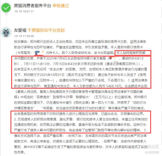 我们留意到去年10月份期间,有用户在黑猫投诉平台上反馈关于郑州银行信用卡涉及不当催收的问题。用户表示,其在郑州银行信用卡的欠款总额为人民币5468.78元,因个人财务安排失当,导致该卡出现逾期。不过,用户本人表示其始终抱有积极解决问题的态度,还曾主动和郑州银行寻求还款协商,并表示本人并无任何“非法占有”恶意。
