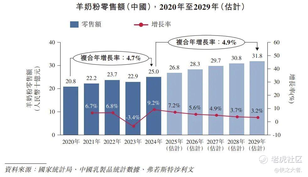 根据弗若斯特沙利文(Frost & Sullivan)的报告,中国羊奶粉零售额持续稳定增长,表现优于整体奶粉市场。2020年至2024年间,羊奶粉零售额从人民币208亿元增长至人民币250亿元,复合年增长率达4.7%。羊奶粉属整体奶粉市场中的分部,作为替代蛋白来源有望实现稳定增长。