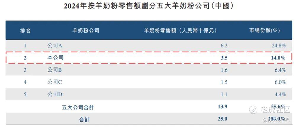 根据弗若斯特沙利文(Frost & Sullivan)的数据,以2024年对应产品的零售额计,(i)公司在中国羊奶粉市场排名第二,市场份额为14.0%;(ii)公司在中国婴幼儿配方羊奶粉市场排名第二,市场份额为17.6%;(iii)公司在中国婴儿特殊医学用途配方食品市场中,排名中国本土品牌第二,市场份额为4.5%。