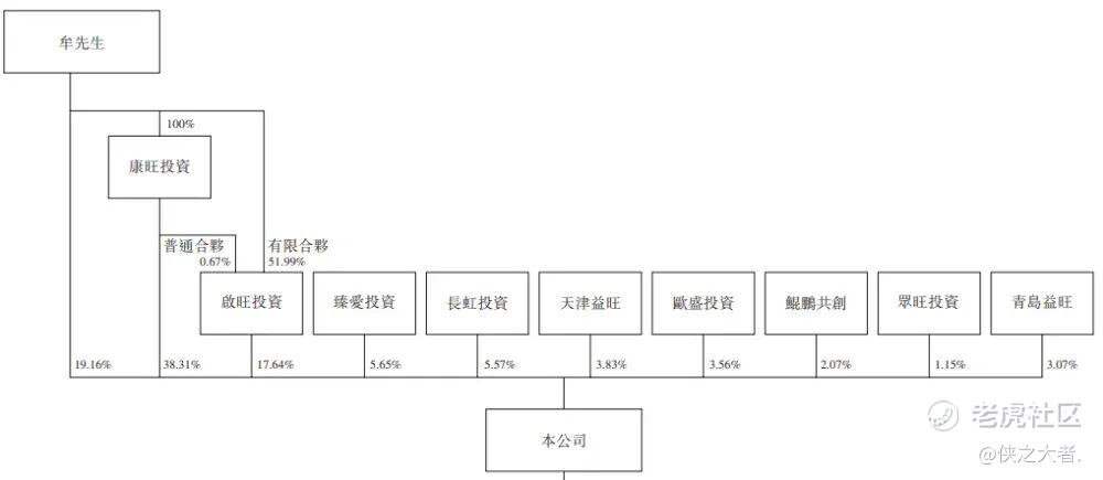 牟先生直接持股19.16%,通过康旺投资、员工持股平台启旺投资分别持股38.31%、17.64%,构成一组控股股东,合计持股75.11%;