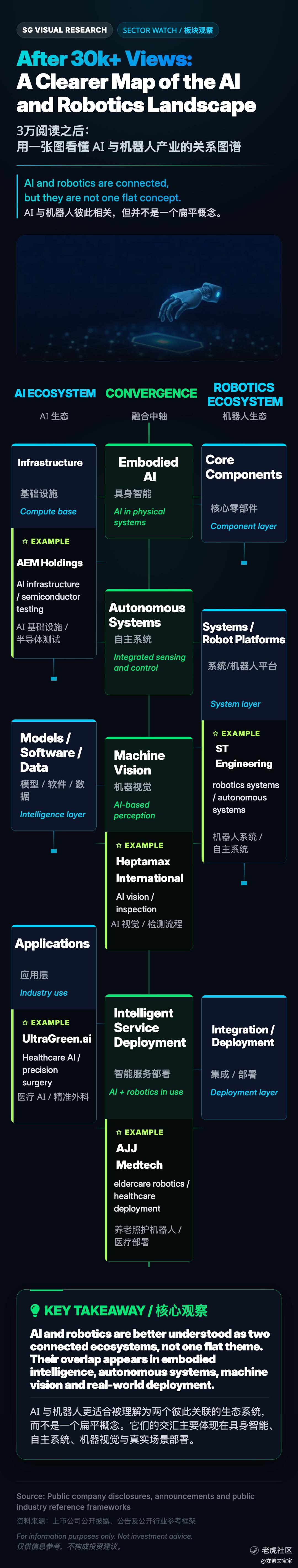 昨天那条帖子全网阅读已经突破 30k+。这一篇我们继续往下拆,不再只是看“有哪些公司”,而是进一步去理解:AI 和机器人其实更适合被看作两个彼此关联、但并不相同的生态系统;而相关的新加坡上市公司,只是分布在其中不同的位置。