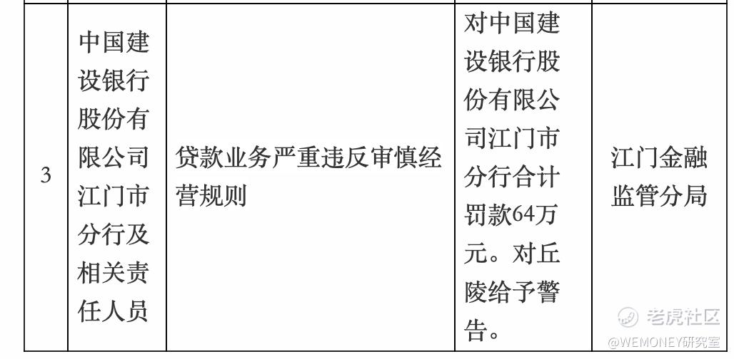 4月15日,国家金融监督管理总局江门监管分局行政处罚信息公示列表显示,中国建设银行江门市分行,因贷款业务严重违反审慎经营规则,被罚款64万元。对丘陵给予警告。