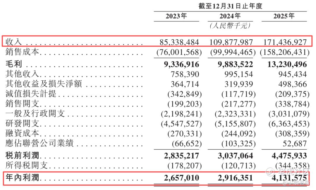 公司从2023~2025年的营收分别是853.38亿、1098.78亿、1714.37亿,2025年营收同比增长56.02%;2023~2025年的净利润分别是26.57亿、29.16亿、41.32亿,2025年的净利润同比增长41.67%,公司业绩非常不错。