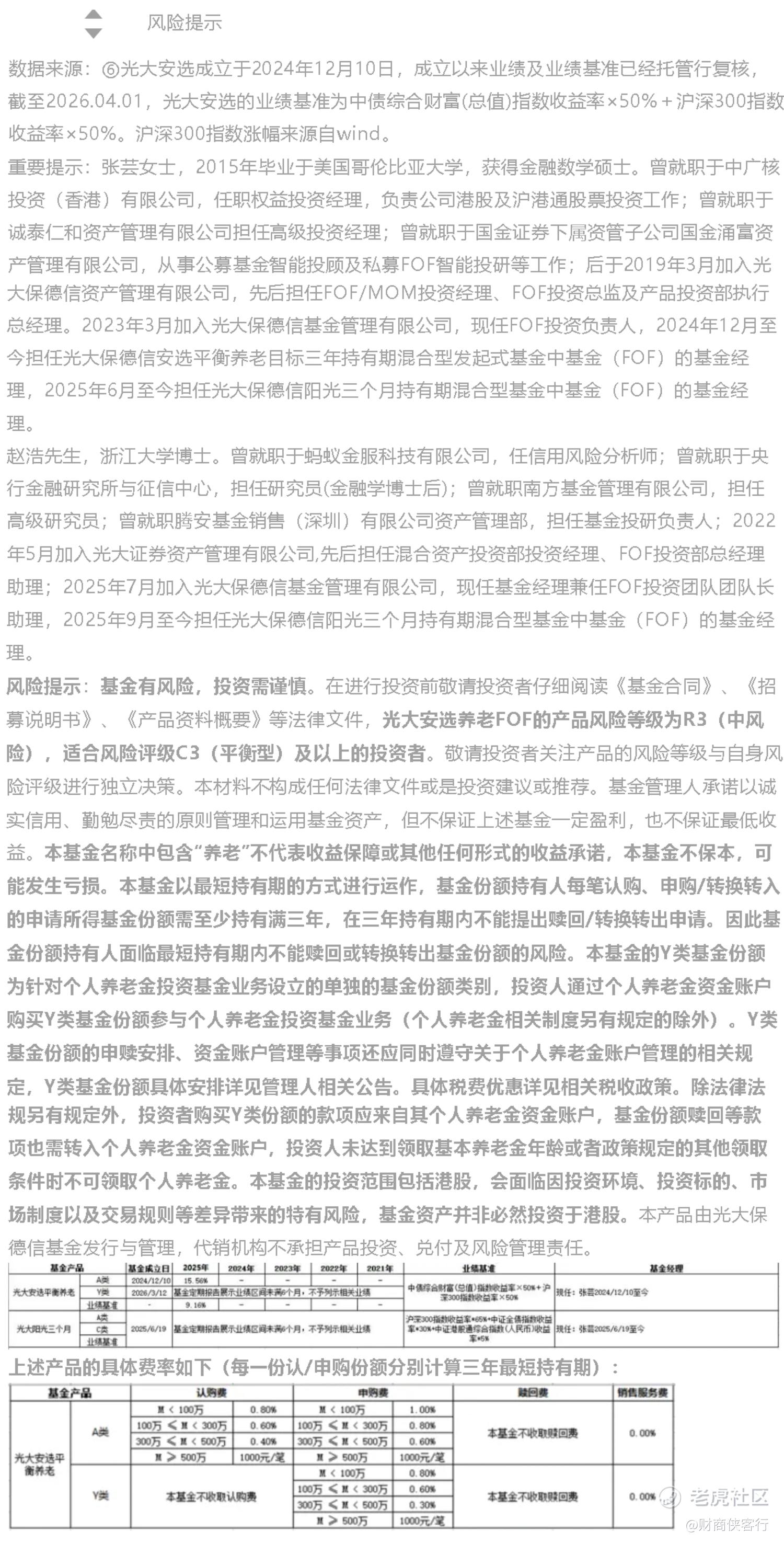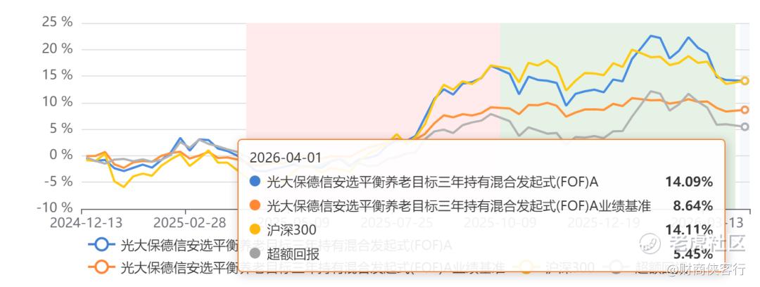 他们的代表作光大安选平衡养老FOF(A类:022376 Y类:026587),凭借均衡底仓+适度轮动的策略,截至今年4月1日,自2024年12月10日成立以来,累计回报达到14.09%,不仅跑赢了业绩基准(8.64%),还几乎追平了同期沪深300(14.11%)!