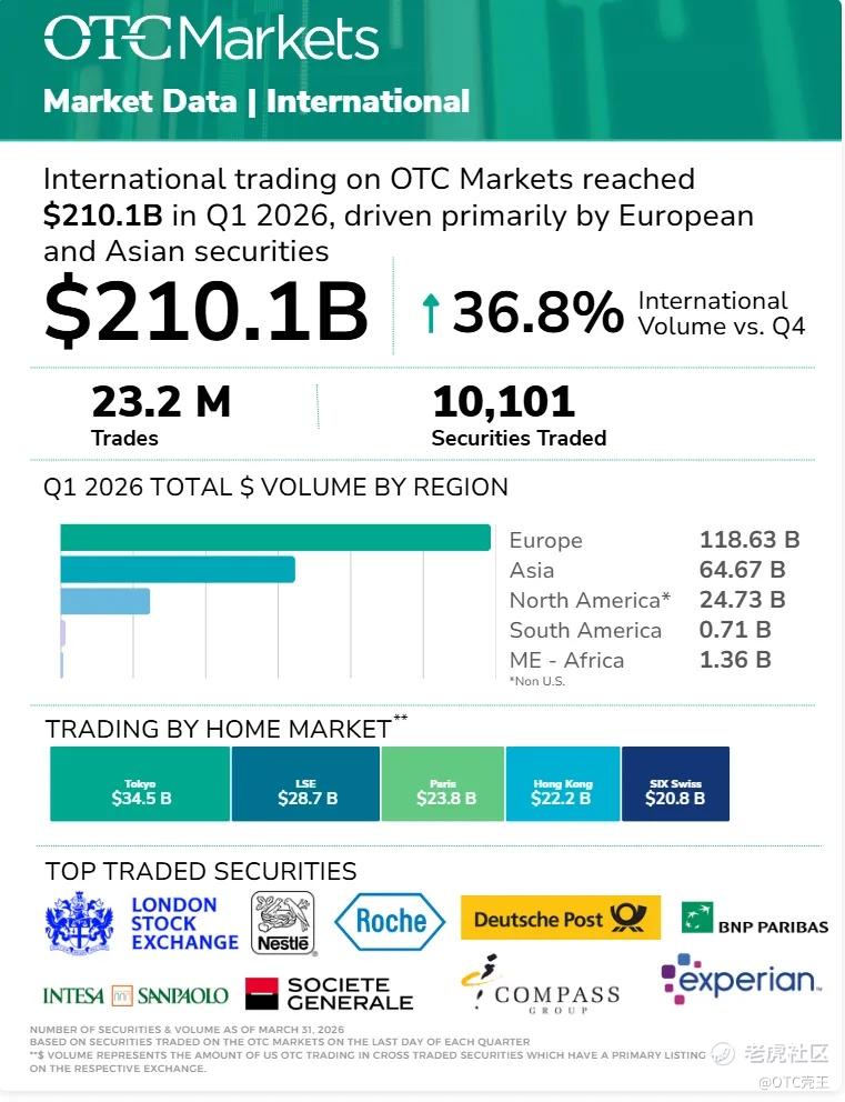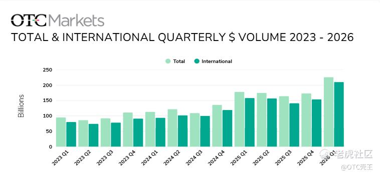 2026年,投资者对全球证券的兴趣持续升温,场外交易市场(OTC Markets)公布2026第一季度国际证券交易数据。