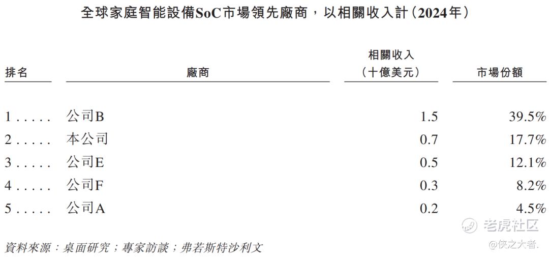 根据弗若斯特沙利文报告,按2024年的相关收入计,公司在专注于智能终端SoC芯片的厂商中位列全球第四(全球市场份额为1.2%),在家庭智能终端SoC芯片领域位列中国大陆第一、全球第二(全球市场份额为17.7%)。