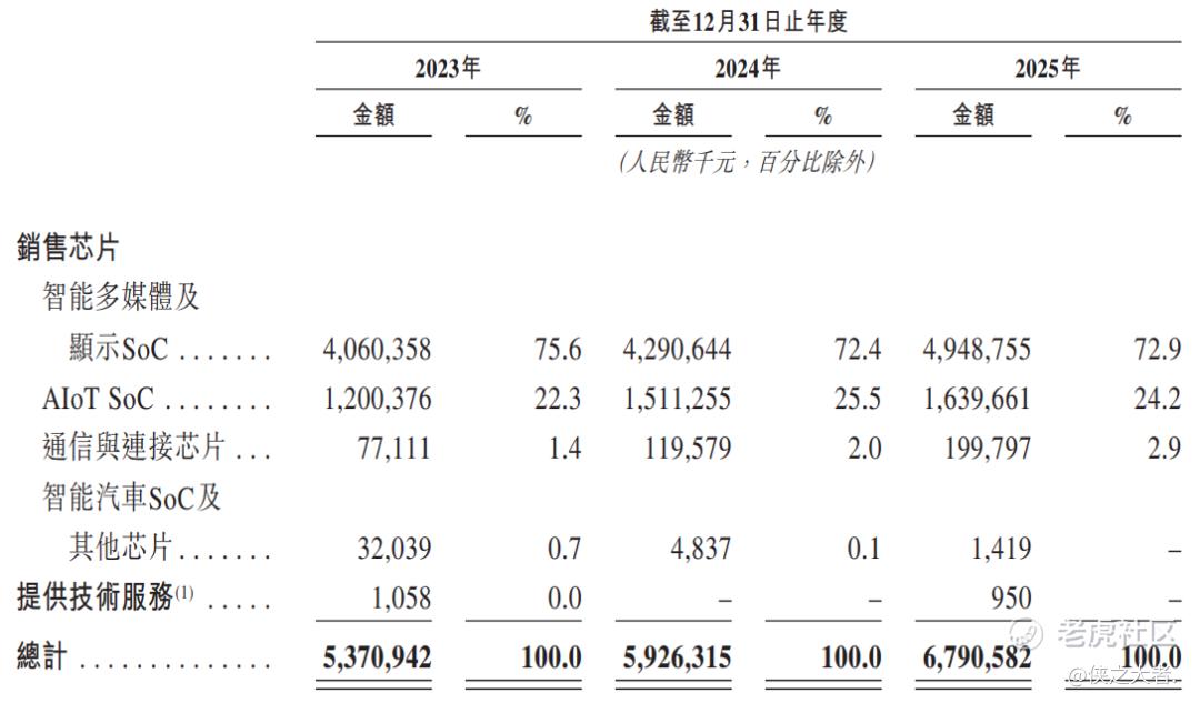 公司收入高度集中于核心芯片业务,智能多媒体及显示SoC为第一大收入来源,2025年贡献占比高达72.9%。AIoT SoC为第二大业务,2025年收入占比24.2%,占比稳步提升,成为重要补充。