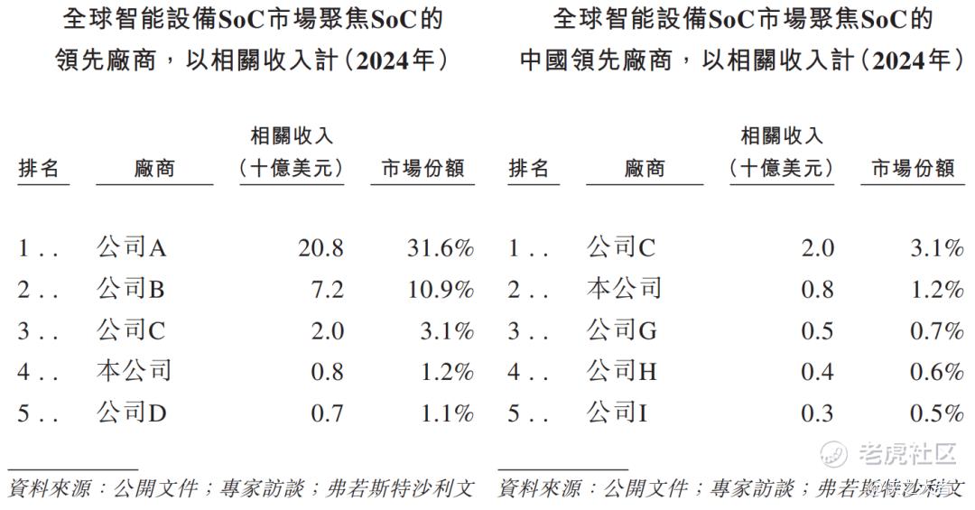 以2024年相关收入计,公司在全球所有智能设备SoC厂商中排名第十一,在全球所有专注于提供SoC的智能设备SoC厂商中排名第四,在中国专注于SoC的公司中排名第二,市场占有率为1.2%。