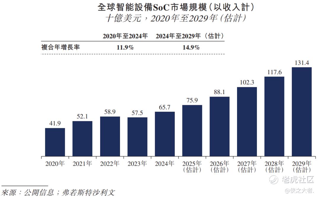 根据弗若斯特沙利文(Frost & Sullivan)的报告,以收入计,全球智能设备SoC市场由2020年的419亿美元增长至2024年的657亿美元,2020年至2024年的复合年增长率达到11.9%。预计至2029年,全球智能设备SoC市场规模将进一步增长至1,314亿美元,2024年至2029年的复合年增长率达到14.9%