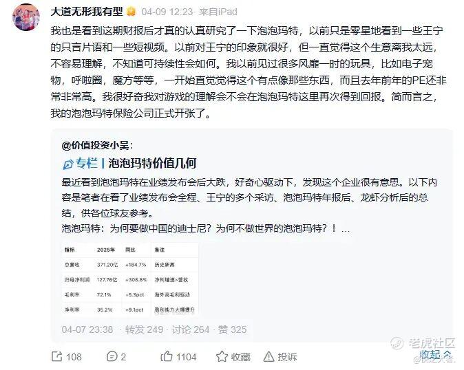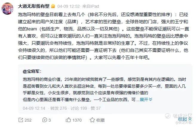 值得注意的是,从段永平在平台上的发言来看,泡泡玛特似乎引发了他强烈的兴奋感和好奇心,而他也认为,泡泡玛特目前已形成用户关注度、艺术家签约、全球门店网络及管理团队等壁垒,只不过潮玩赛道的持续性或许仍需时间验证。
