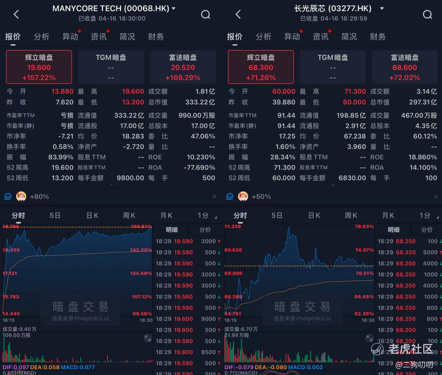今天下午 $MANYCORE TECH(00068)$ 、 $长光辰芯(03277)$ 暗盘,涨幅都很炸裂,群核科技最高涨幅超过了150%+,净赚6000块;一个70%+,净赚3000块,妥妥都是大肉。。。。