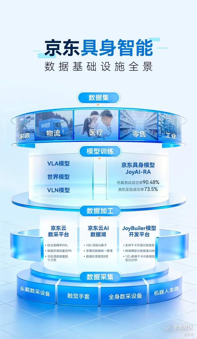 京东集中发布具身智能相关产品与基础设施,不仅填补了行业在数据采集、处理、流通环节的空白,更构建起“硬件采集-数据处理-模型训练-仿真测试-合规交易-生态共建”的完整产业链条。