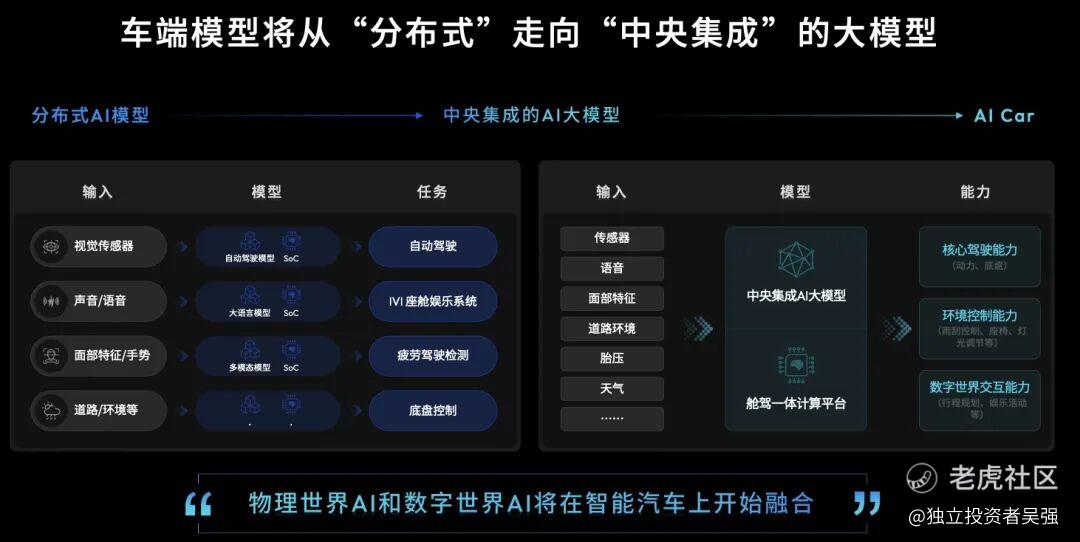 将车端AI从分散的分布式模型,升级为中央集成大模型,以一颗核心芯片的算力,统管驾驶、座舱、全车控制等全场景,将物理世界和数字世界的AI真正融合在一起。