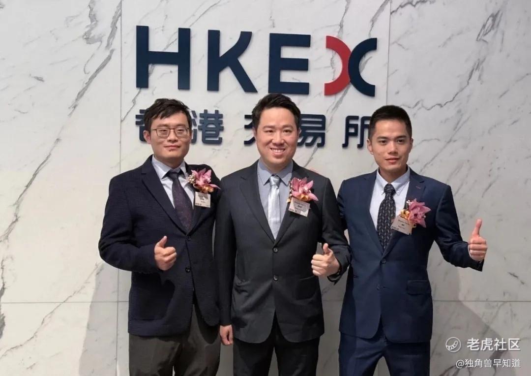 敲锣现场,三位联合创始人——黄晓煌、陈航、朱皓紧紧相拥,并特意还原了15年前创业初的一张合影姿势。