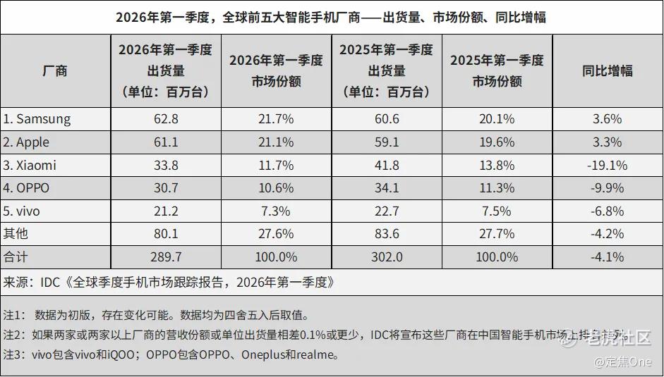 全球市场同样在洗牌。IDC数据显示,2026年第一季度全球智能手机出货2.897亿部,同比下滑4.1%,这是自2023年年中以来全球大盘首次下跌。三星重回全球第一(6280万台);苹果第二(6110万台),小米保住了第三的位置(3380万台),但它19.1%的同比跌幅也是全球前五中最大的。OPPO和vivo分列四、五名。