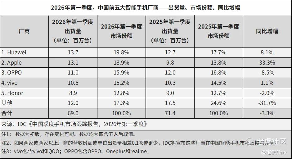 4月中旬,Omdia和IDC先后发布了2026年第一季度中国智能手机市场报告:**稳居第一,苹果第二,OPPO和vivo分列三四名。