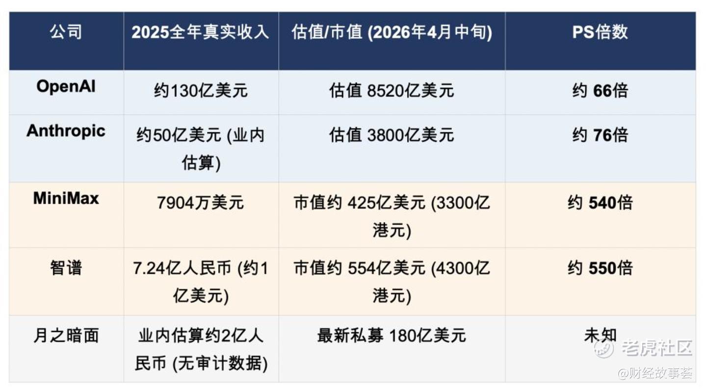 把它推到这个位置的,不是它自己,是身边那两家已经上市的同行。智谱1月8日敲钟,MiniMax 1月9日敲钟,到四月中旬,智谱涨了近700%,MiniMax涨了480%。按2025年全年真实收入算,两家的市销率高达540到550倍,是OpenAI(66倍)和Anthropic(76倍)的七到八倍。
