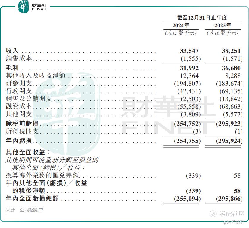 财务表现上,公司2025年总收入为3825.1万元,同比增长14%;年内亏损2.96亿元,同比扩大16.16%。