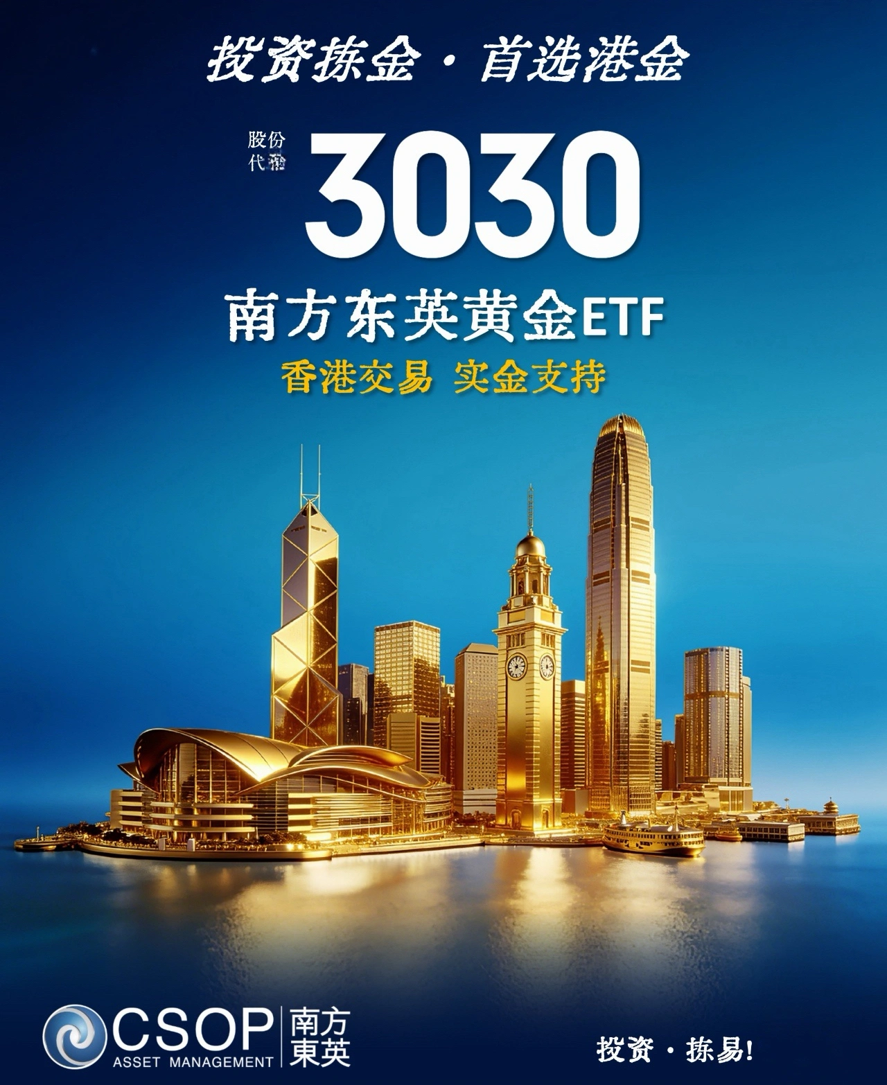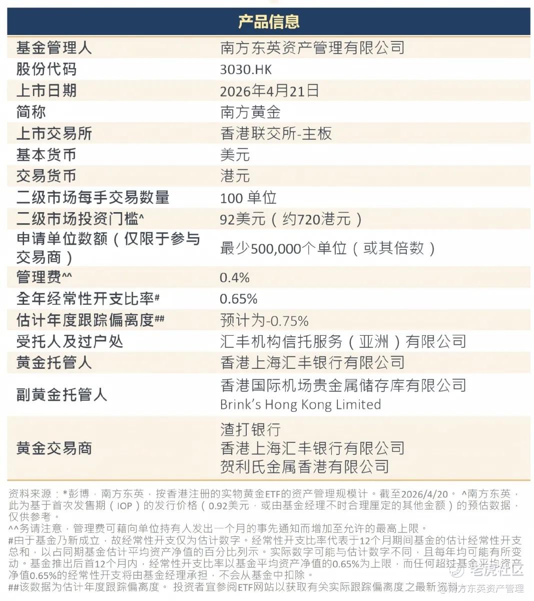 $南方黄金(03030)$ 于 4 月 21 日在港交所正式上市,初始规模约 56 亿港元,是香港最大的本地实物黄金 ETFⅰ。3030.HK 直接追踪 LBMA 上午黄金价格表现,支持现金或实物黄金多种申赎选项,同时黄金存放于香港并在本地交易,兼顾便利性与风险管理。