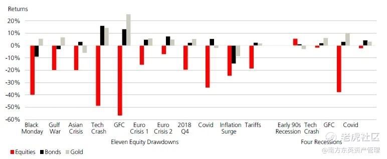 图表 2 在 1975-2025 年的历次股灾和衰退中,黄金表现较股票和债券跌幅更小、抗跌性更强