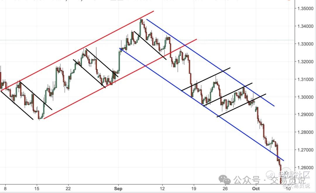 其背后的原理是相同的。价格在两条相互平行的线之间运行。这两条线连接着交易时段的低点和高点(或收盘价),并对角线地向上或向下移动。