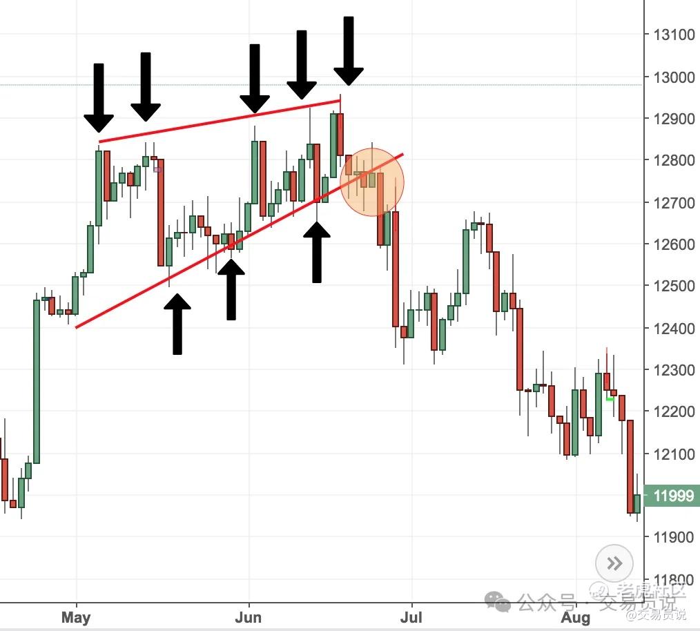 通常,单条趋势线被突破后,也会被回测。让我们看另一个例子……