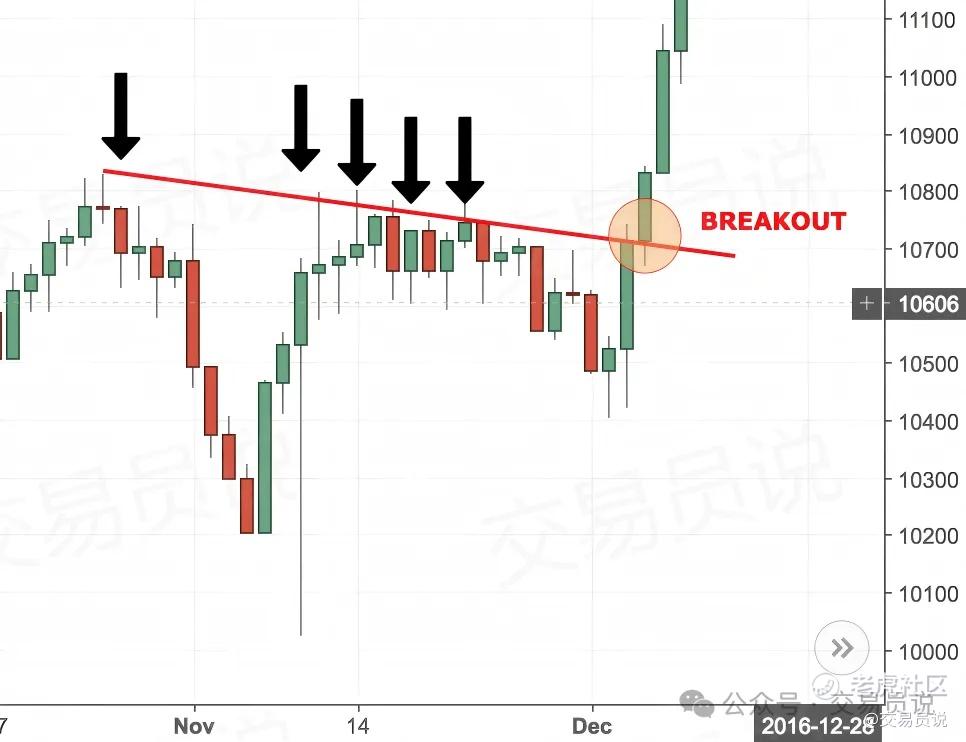 趋势线也可以成为交易突破的有力预测工具。在下面的例子中,使用了一条趋势线来显示阻力区域。一旦这条趋势线被突破,价格就会大幅上涨,达到新的均衡水平: