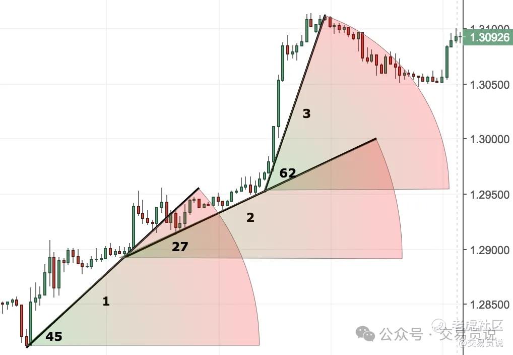 随着时间的推移,趋势趋于稳定,角度减小。在第二条趋势线中,你可以看到角度已经变为27度。市场参与者仍然看涨,但速度更加温和。随着趋势的成熟,更多的资金开始换手,角度进一步增大。第三条趋势线的角度为62度,是其中最大的。