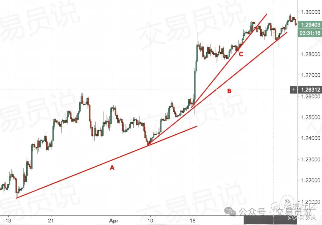 图中展示了3条不同的趋势线。第一条的角度为45度。这是趋势的起始阶段,比第二条更陡峭。这显示了市场参与者准备迅速抓住该交易机会的意愿。