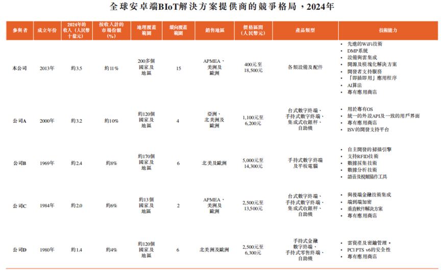 当前,商业物联网行业正处于高速发展期,全球市场规模持续扩大,根据灼识咨询,2024年全球BIoT解决方案市场规模约2350亿元,2020年至2024年复合年增长率5.6%,预计到2029年将达到3130亿元,2024至2029年复合年增长率5.9%。其中,安卓系统凭借开源、低成本、兼容性强的优势,正在逐步替代Windows等传统系统,带动安卓端BIoT市场增长速度远超行业整体,2024年市场规模约320亿元,预计2029年增至920亿元,复合年增长率高达23.7%,渗透率也将从14%提升至29%,行业参与者增长空间广阔。
