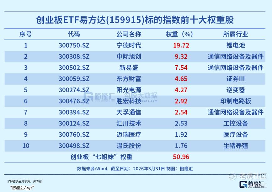 创业板指数由创业板100只市值大、流动性好的龙头企业组成,覆盖新能源、生物医药、信息技术等新质生产力核心赛道,权重股中宁德时代、中际旭创、新易盛、东方财富、阳光电源、胜宏科技、天孚通信等“创业板七姐妹”占比50.96%。