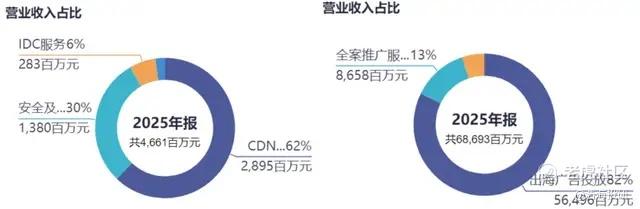 两家公司虽同处#数字营销与互联网基础服务 赛道,但所处产业链位置不同,决定了它们的盈利逻辑也截然不同。网宿科技更像是流量世界的“底座”,主营CDN、边缘计算、云安全和IDC等基础能力,其中CDN业务收入28.95亿元,占比62.11%,仍是绝对主力;同时,边缘云、云安全等新业务也在补充收入弹性,但整体仍偏向“卖基础设施、吃规模效率”的模式。