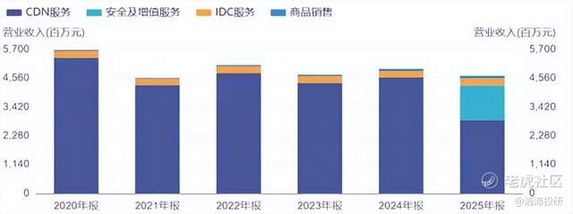 不过,看似亮眼的报表下也有一定风险。首先就是公司的传统业务CDN服务,面对着营收的绝对值的下滑。2020年这部分能为公司贡献近55亿收入,而5年之后却下降到了30亿,接近腰斩。可见主营业务面对着巨大的竞争压力。