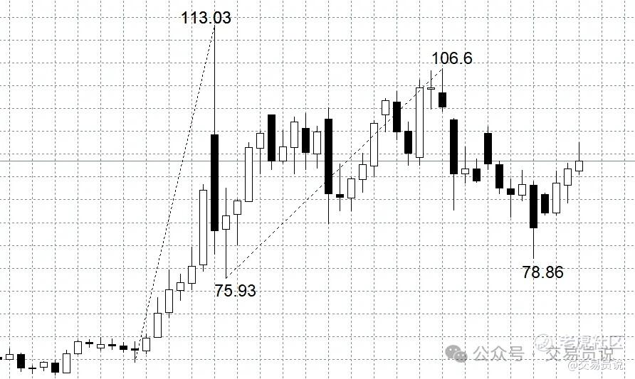 行情图表方面,国际油价最新的中期高点阻力位是106.6,最新的中期低点阻力位是75.93。如果只看上图的话,可能会觉得78.86是新的中期低点。但由于78.86还需要右侧一个底分型的验证,所以他现在不能成为中期低点。考虑到上方106.6美元的压制,右侧形成标志性底分形的空间被极大地压缩,未来78.86倍向下跌破否认其中期低点地位的概率较高。