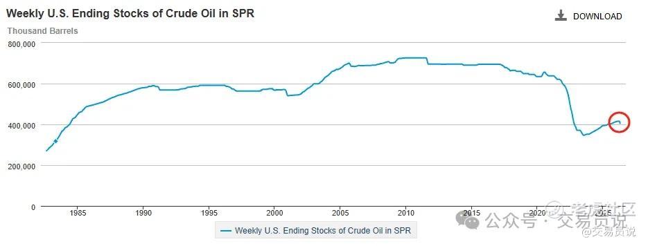 上图是美国战略石油储备的曲线,最近六年出现了明显的下降,2023年年中跌至阶段性低点,当时的战略库存总量约为3.46亿桶。过去三年战略石油储备持续反弹,从今年二月份开始,曲线又出现了拐头向下的迹象。原因非常明确,就是美国和伊朗之间的战争导致高油价,美国不得不释放战略石油储备以稳定供应端。
