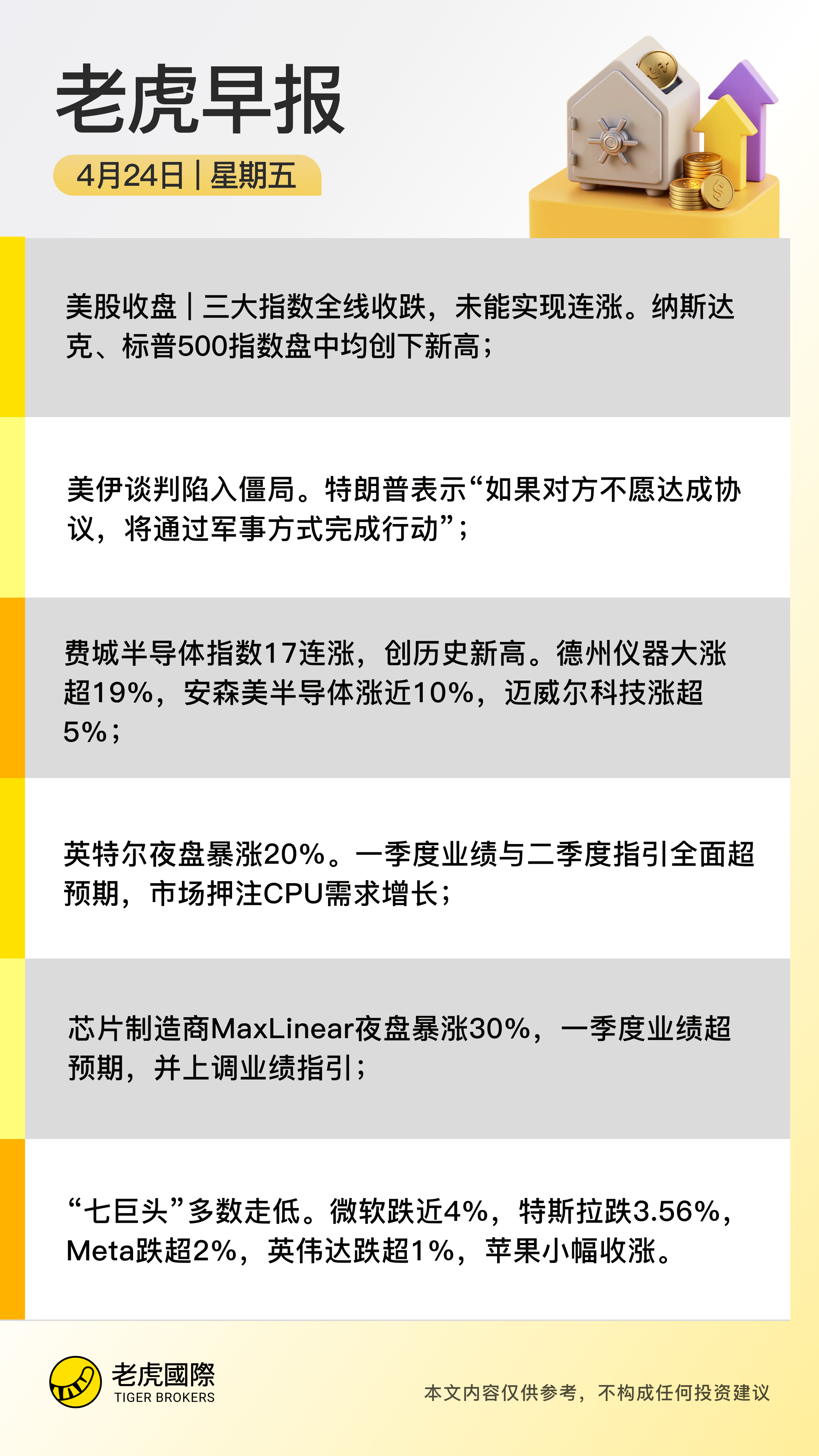 周四(4月23日),截至收盘,道指跌179.71点,跌幅为0.36%,报49310.32点;纳指跌219.06点,跌幅为0.89%,报24438.50点;标普500指数跌29.50点,跌幅为0.41%,报7108.40点。费城半导体指数 17连涨,创历史新高。 德州仪器 大涨超19%,创下自2000年10月以来的最大单日涨幅,公司预测第二季度营收和利润将超出华尔街预期。安森美半导体涨近10%,迈威尔科技涨超5%。