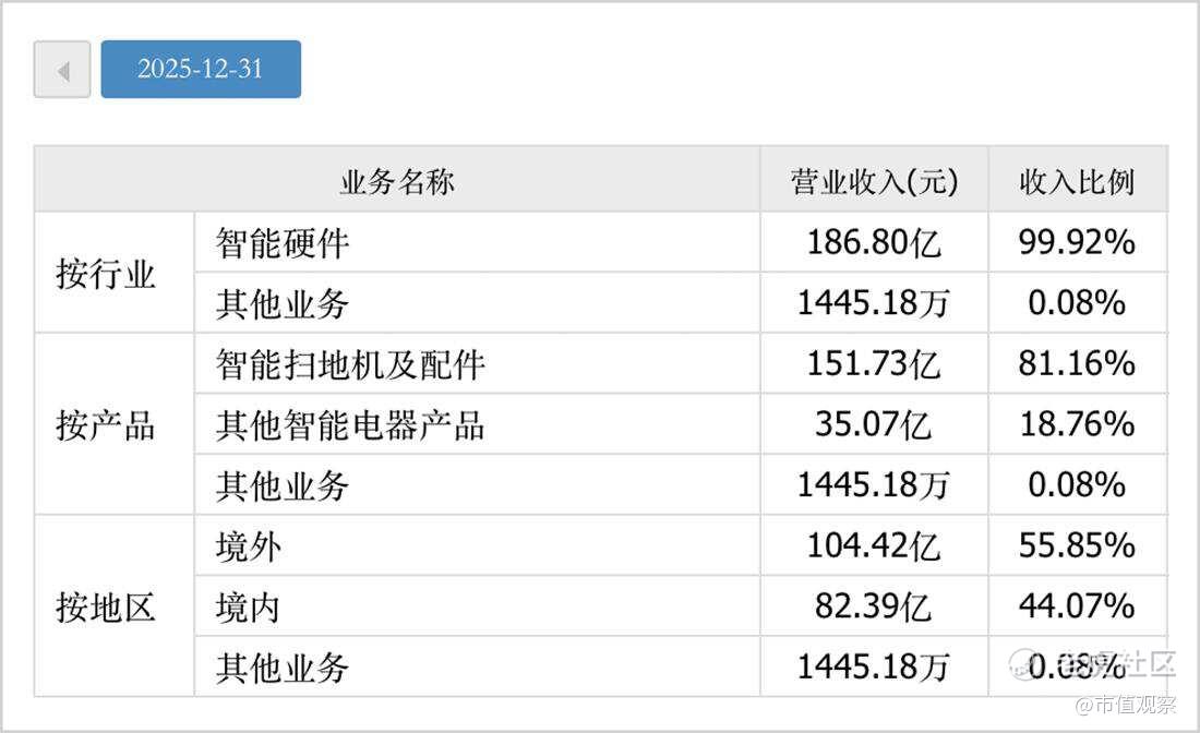 除了传统的扫地机器人外,洗地机、洗烘一体机等新品,展现出强劲爆发力。以洗地机为代表的其他智能电器产品销售216.89万台,同比大增250.45%,助力智能家居清洁产品的收入由2022年的2.65亿元大幅增长至2025年的35.07亿元,在整个公司营收里的占比已经接近19%。
