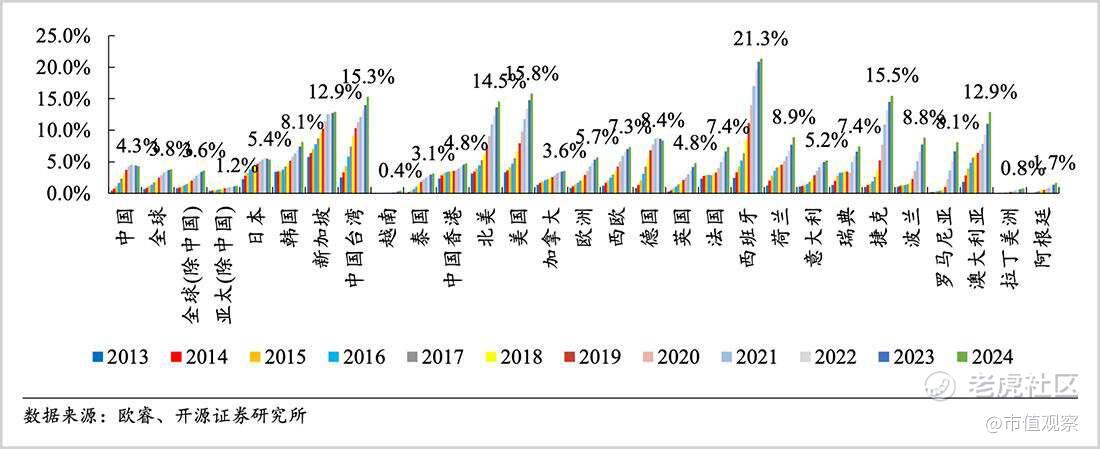 尽管受到国补政策催化,近两年国内扫地机器人迎来一波井喷,但根据开源证券测算,我国扫地机行业渗透率仅为4.9%(2025年)。而2024年,全球渗透率也仅有3.8%,欧洲地区5.7%,美国稍高一些,但也仅16%,行业尚处于早期阶段。