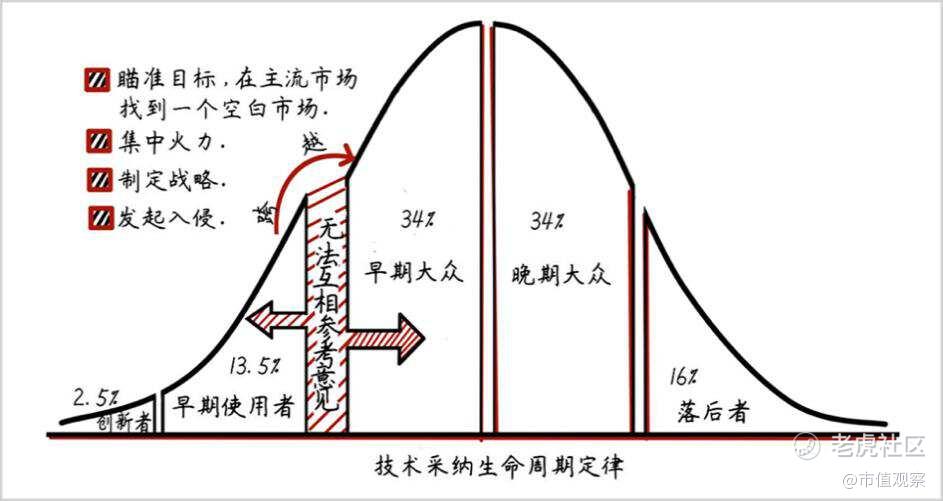 咨询大师杰弗里·摩尔在《跨越鸿沟》一书中写道,一款技术型新品要想在大众市场普及,先是2.5%的技术狂热者接触,紧接着吸引13.5%的早期用户;随后,渗透率会逐渐增加,最终成为畅销品。