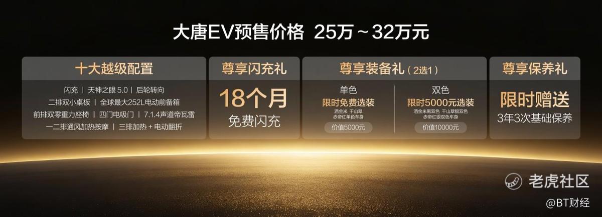 此次大唐EV共推出800KM后驱、950KM后驱、850KM四驱三种续航,预售价25万元~32万元。预售期间下订,可享18个月免费闪充权益、三款单色车漆0元选装、双拼色限时半价5000元及3年3次免费保养等多重尊享礼遇。