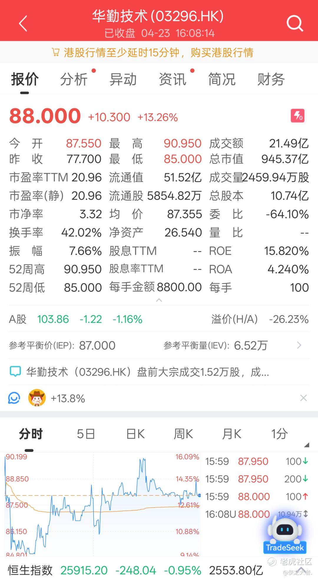 上市首日,华勤技术股价高开12.68%,最高冲至90.95港元,最终收至88.00港元,收涨13.26%。首日收盘总市值达945.37亿港元,较A股折价26.23%,全天成交额约21.49亿港元。若按收盘价计,每手中签赚约1030港元。