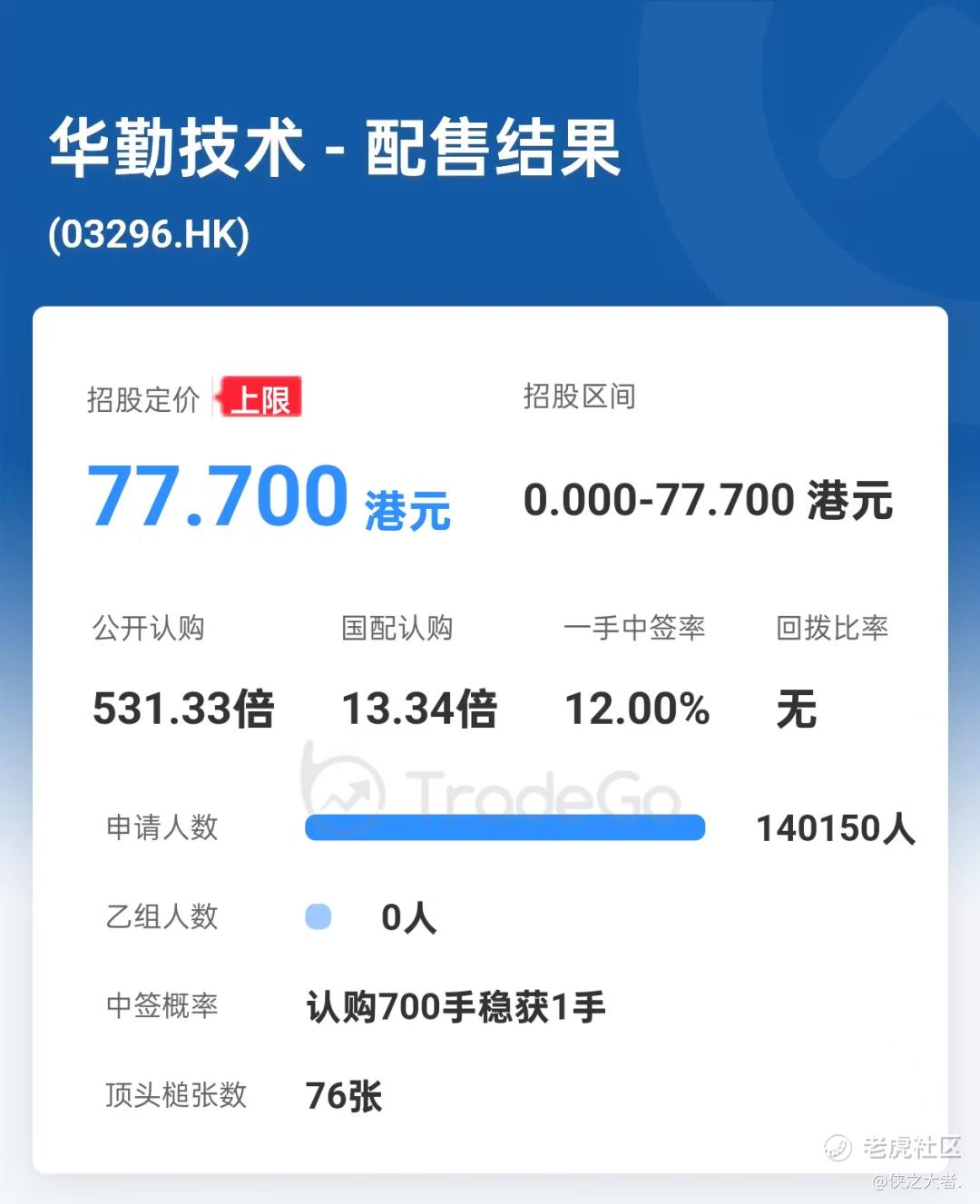配售结果显示,华勤技术本次申购人数共140150人,公开认购531.33倍,国配认购13.34倍,无回拨,一手中签率12.00%。